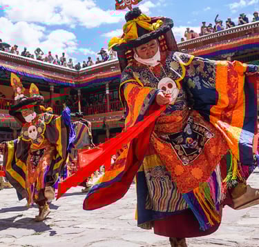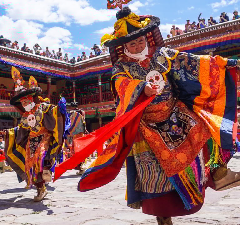 Ladakh’s cultural richness extends far beyond its monasteries into a vibrant tradition of folk music and dance, which plays a vital role in community life and religious expression. Among the most iconic performances is the Chham, or masked dance, performed primarily by monks during monastery festivals. These powerful dances, accompanied by traditional instruments such as long horns, cymbals, and drums, symbolise the triumph of good over evil and serve as a spiritual teaching conveyed through movement, colour, and rhythm.
